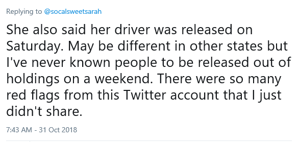 Then, random claims their driver was released from holding the morning they announced the sting — which was on October 27th, Saturday AKA the weekend.