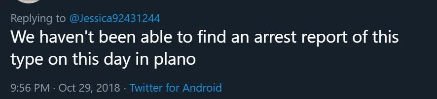 A random account on Twitter announced being the victim of a sting operation in Plano, Texas; however, it never happened.