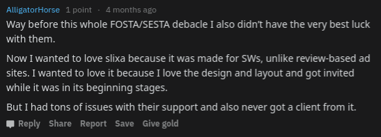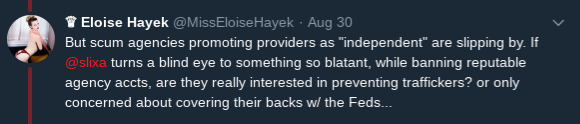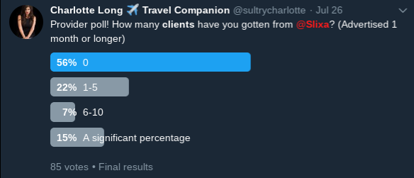 Slixa has become a bit more strict with their policy and all; however, they have become a bit more harsh to escorts with reasons unrelated to their policy. Slixa also increased their rates for their advertisements after FOSTA passed; however, numerous escorts complain that Slixa is bloody expensive with no return!