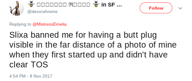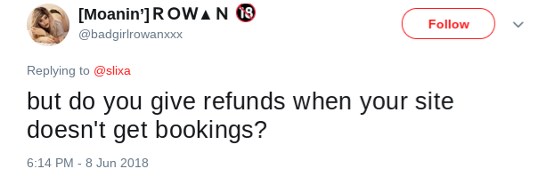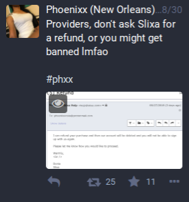 A provider tooting on Switter about how Slixa threatened to ban her over a refund.