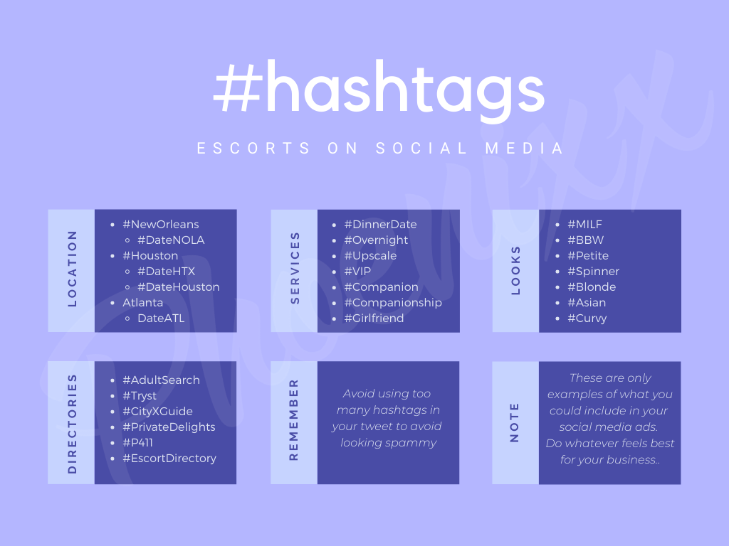 They help your ad trend. Use hashtags that related to your location, the terms you like to call yourself (escort, companion, etc), incall/outcall, etc.