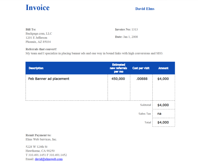 Dave Elms (founder of TER) invoice to Backpage.