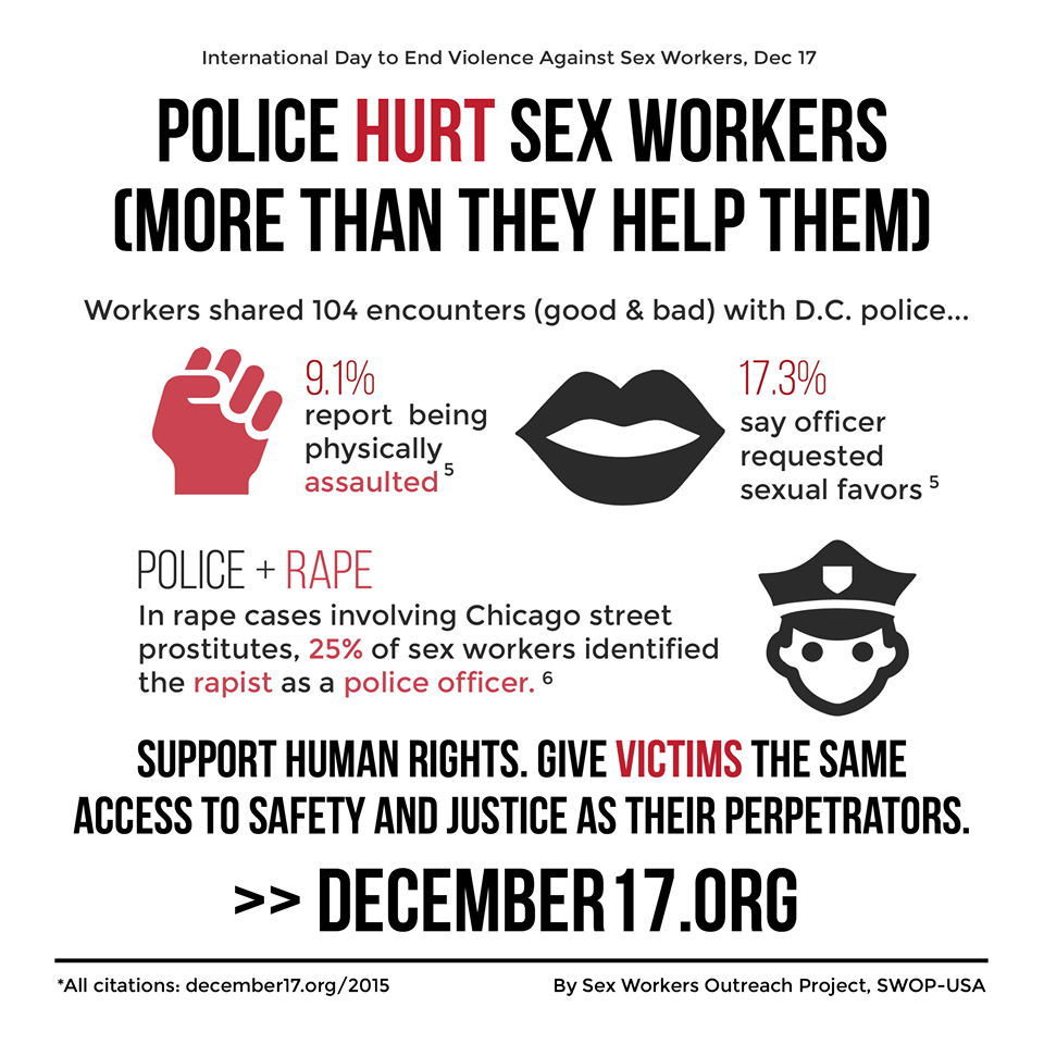 “Sex Workers are especially vulnerable to police violence, as police officers can threaten victims with arrest or stage an arrest and sexually assault victims. ”