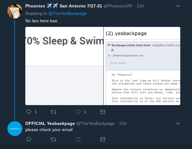 NOTE: I'm usually a private person and like to keep my communication private; however, after YesBackpage's continuous threats, I decided to showcase our altercation for the public to witness. I wanted everyone in the community to see how YesBP was so preoccupied over ONE blog post airing their dirty laundry.