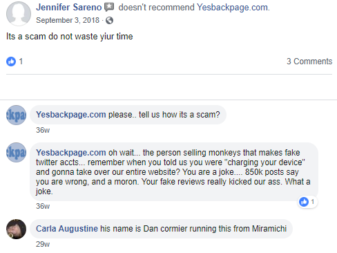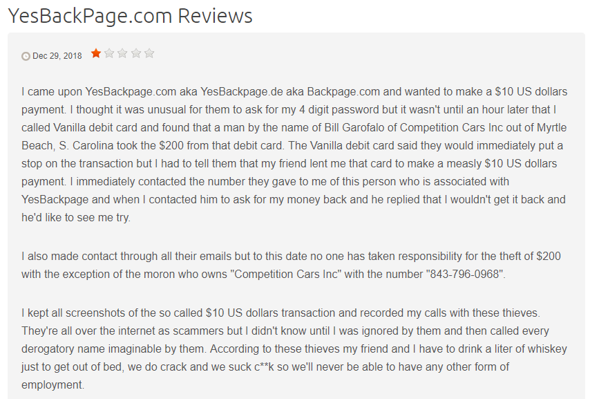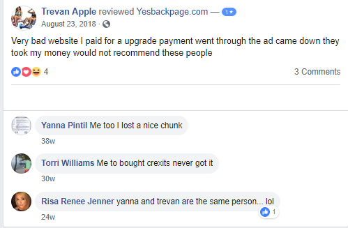 Links below to reviews from consumers who were scammed by YesBackpage's previous company, Backpagecredits.
